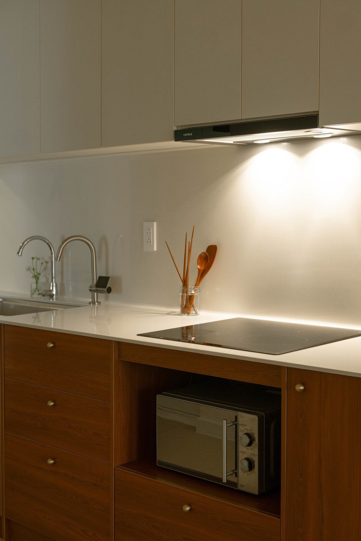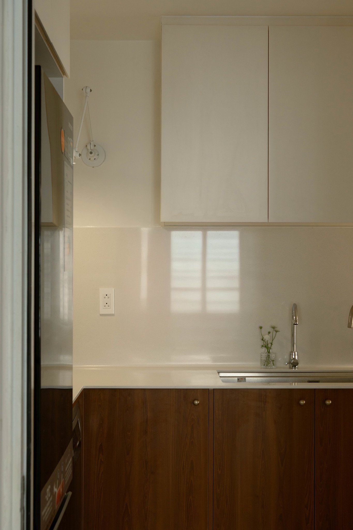 Từ bố cục bếp kín phổ biến của phong cách chung cư cũ, Nhà đã tháo bỏ tường ngăn cách để tạo nên phòng bếp rộng rãi, thông suốt với phòng ăn và phòng khách, vừa nhận được ánh sáng tự nhiên vừa đủ, vừa tạo cảm xúc gắn kết mọi người khi sinh hoạt chung. Nhà tạo thêm 1 mũi bo tròn nhỏ ở đầu bếp, nhằm là điểm nhấn khi từ ngoài cửa bước vào trong, vừa thuận tiện để gia chủ đặt để đồ bếp, hay lọ hoa điểm xuyến không gian.