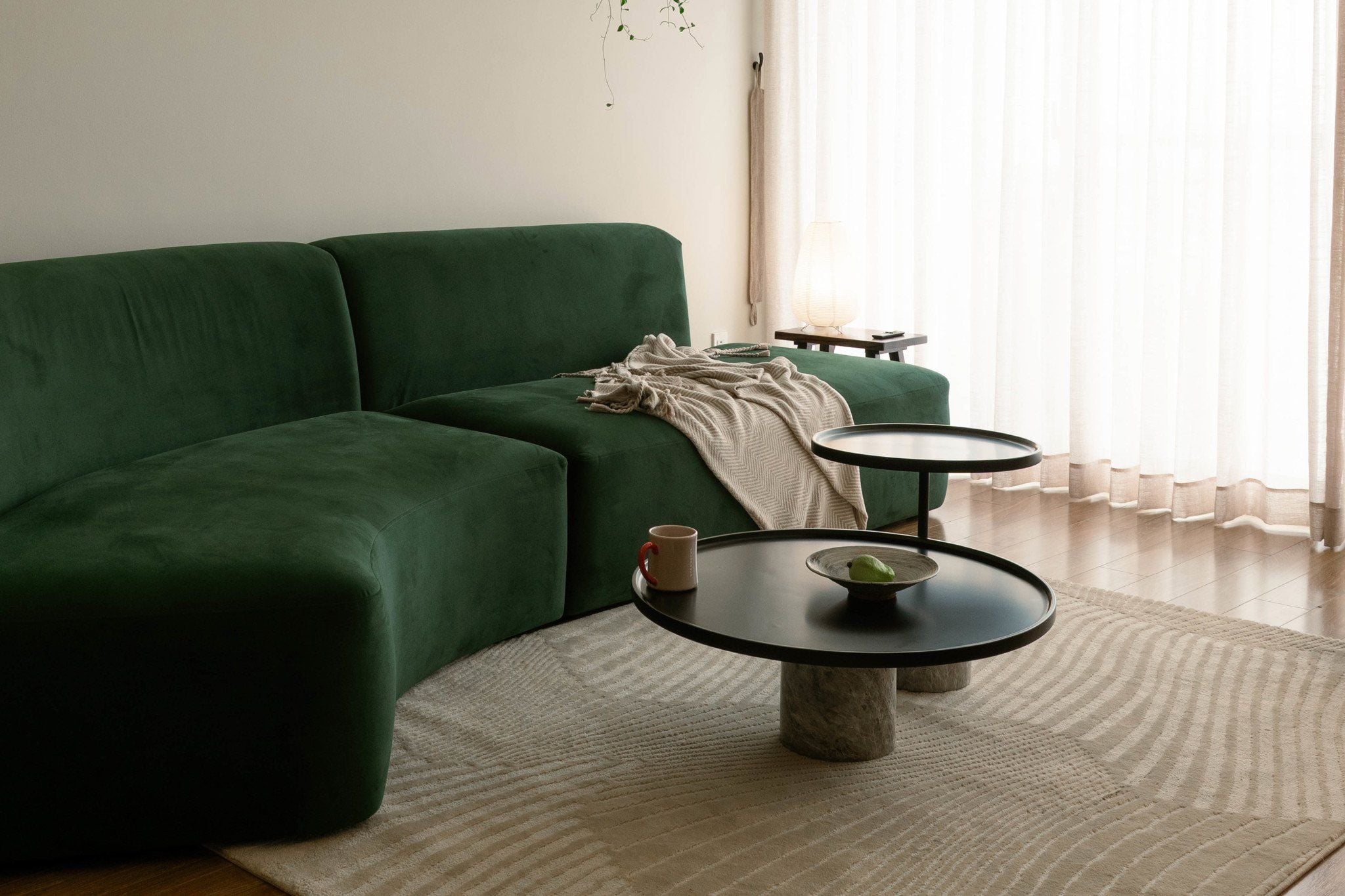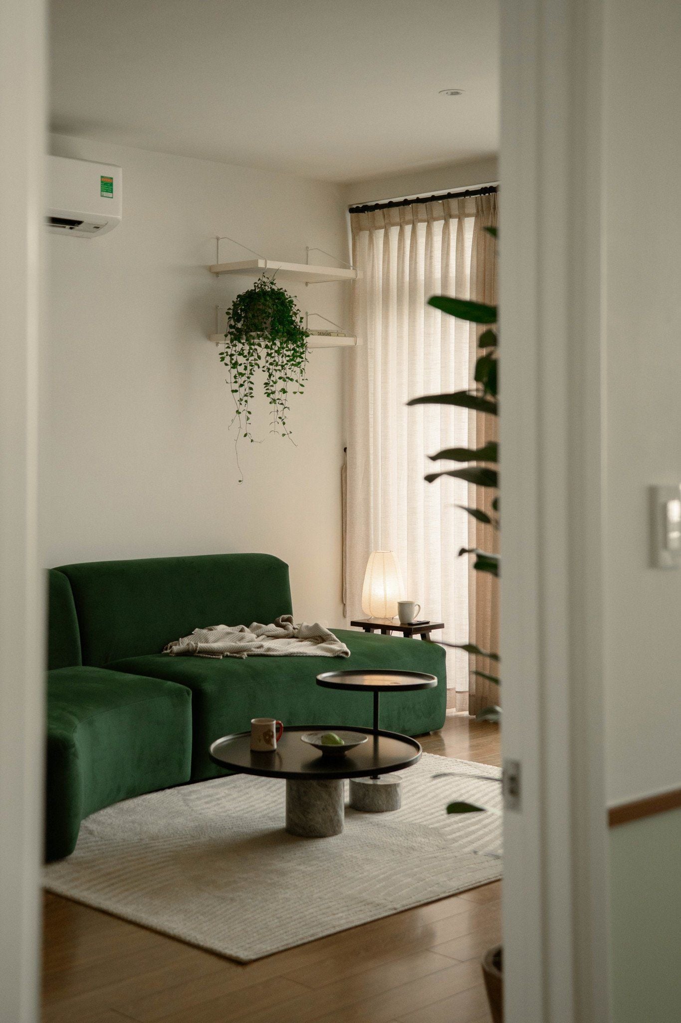 Không gian phòng khách cởi mở với bộ sofa xanh nhung hơn 2m bo cong, kết hợp cùng 1 số sản phẩm nội thất là món đồ yêu thích nhất, từ đó chọn lọc những vật dụng khác có cùng ngôn ngữ thiết kế để tạo sự hài hòa về hình khối, màu sắc và vật liệu từ đó tạo nên cảm xúc thoải mái khi ở trong chính không gian sống của gia chủ.