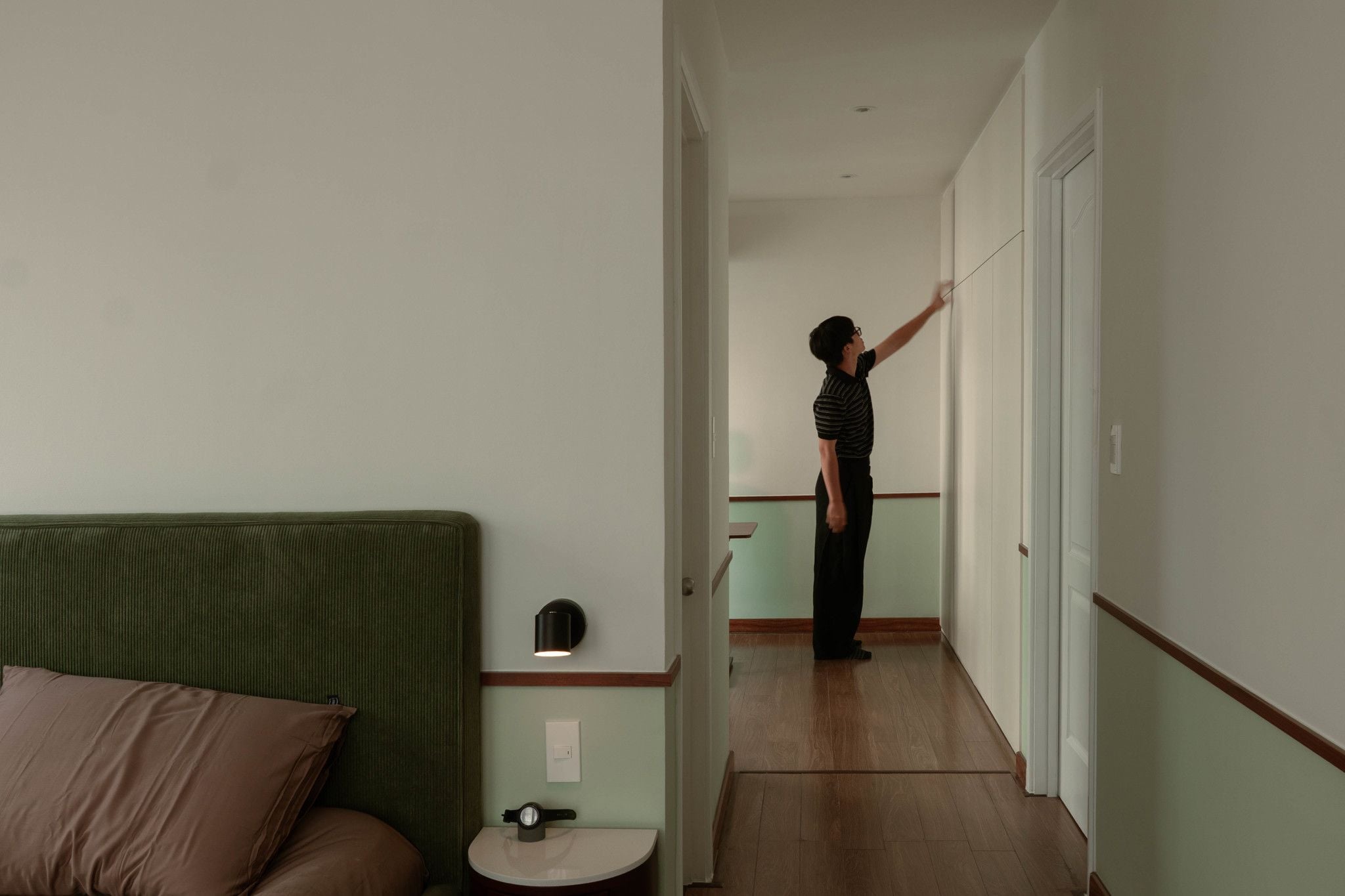 Các vách ngăn được lược bỏ không chỉ mở rộng cảm giác không gian mà còn tối ưu hóa chức năng cho từng khu vực một cách trọn vẹn. Phòng ngủ Master mang hiệu ứng đóng - mở, kín đáo với không gian chung nhưng lại kết nối trong không gian riêng vơi giải pháp đập thông 2 phòng ngủ cũ thành không gian liên thông Phòng ngủ - Nhà vệ sinh - Phòng làm việc.